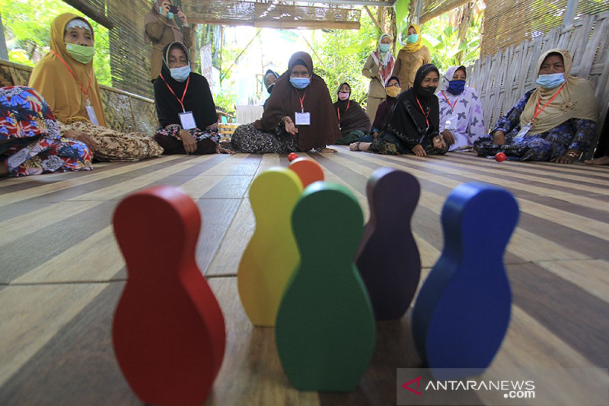Sejumlah warga Lanjut Usia (Lansia) mengikuti lomba lempar bola di Kebun Gizi desa Berdaya Tegalurung, Balongan, Indramayu, Jawa Barat, Senin (31/5/2021). Lomba yang diikuti warga lanjut usia tersebut dalam rangka memperingati Hari Lansia Nasional sekaligus mengkampanyekan gaya hidup sehat. ANTARA JABAR/Dedhez Anggara/agr