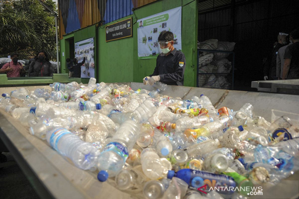 Petugas memilah sampah plastik di Pusat Daur Ulang Cicabe, Bandung, Jawa Barat, Selasa (7/9/2021). Pusat Daur Ulang Cicabe Kota Bandung mampu mengolah 500 kilogram hingga 1 ton sampah plastik per hari untuk diolah menjadi bijih plastik. ANTARA FOTO/Raisan Al Farisi/agr