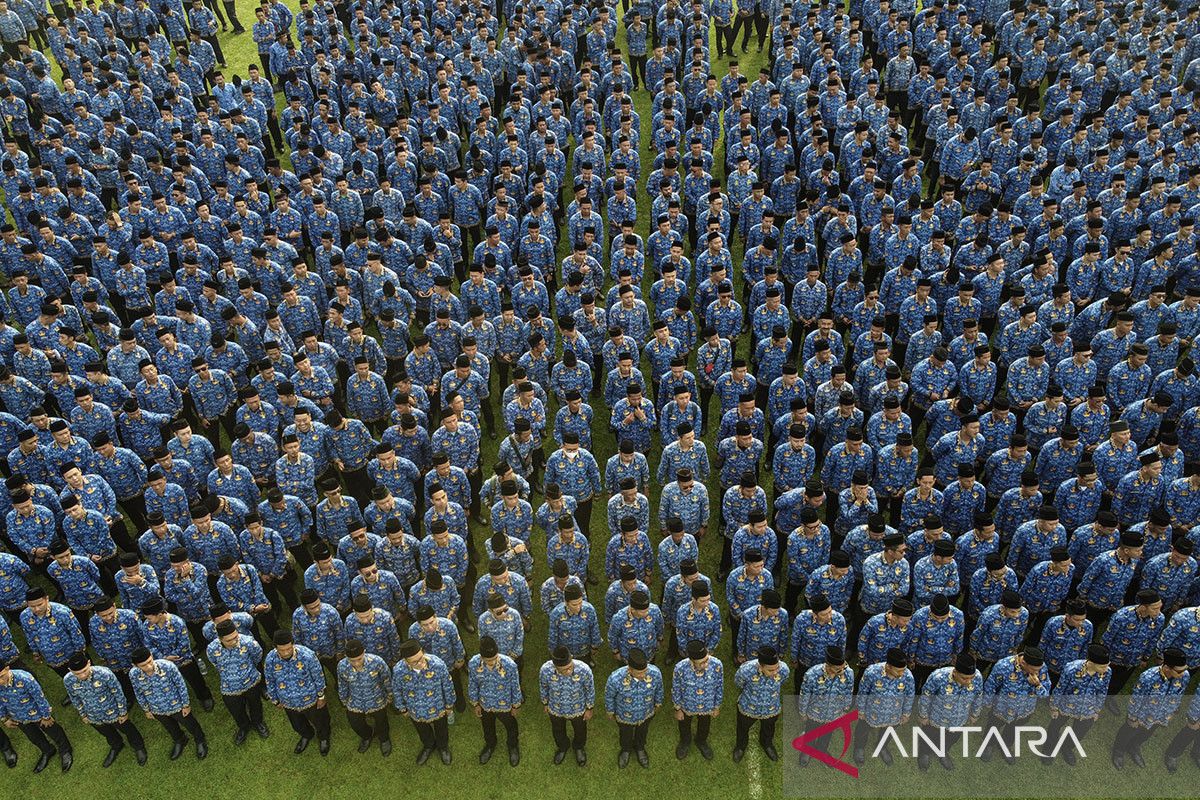 Foto udara ribuan Pegawai Pemerintah dengan Perjanjian Kerja (PPPK) paruh waktu mengikuti upacara penyerahan Surat Keputusan (SK) pengangkatan di Stadion Galuh, Kabupaten Ciamis, Jawa Barat, Selasa (23/12/2025). Pemerintah Kabupaten Ciamis menyerahkan SK kepada 3.554 PPPK paruh waktu formasi tahun 2025 yang terdiri dari guru, tenaga pendidik, tenaga teknis di OPD dan kecamatan serta tenaga kesehatan. ANTARA FOTO/Adeng Bustomi/agr