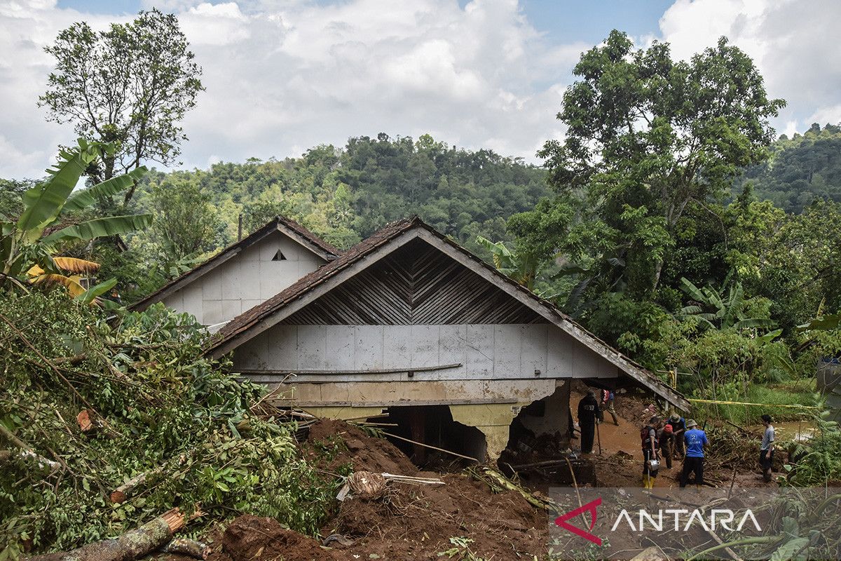 Tim SAR gabungan membersihkan material tanah longsor yang menimbun rumah warga di Desa Sukamanah, Kecamatan Sindangkasih, Kabupaten Ciamis, Jawa Barat, Selasa (3/2/2026). Curah hujan tinggi disertai angin kencang pada Senin (2/2) mengakibatkan satu rumah tertimbun tanah longsor dan menyebabkan satu orang lanjut usia meninggal dunia, serta dua rumah lainnya terancam longsor susulan. ANTARA FOTO/Adeng Bustomi/agr