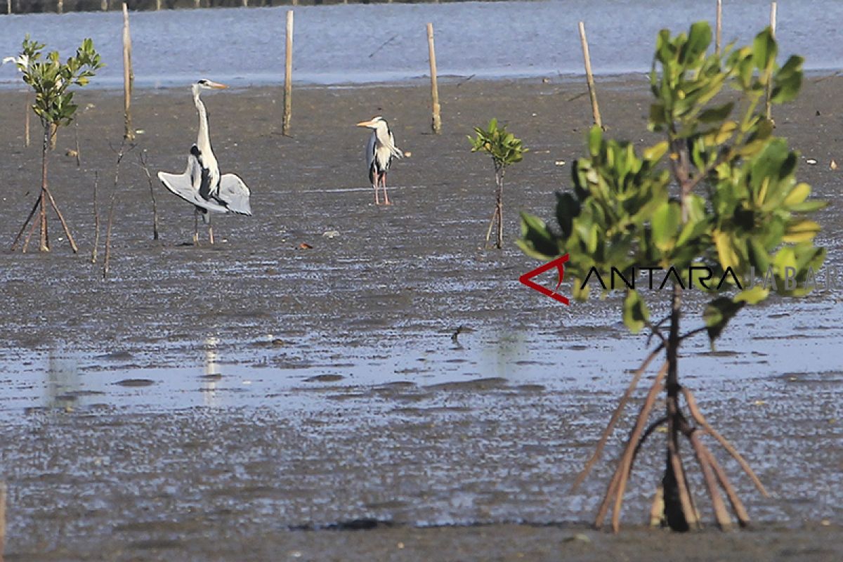 Kawanan burung cangak abu (Ardea cinerea) mencari makan di kawasan mangrove pantai Tiris, Indramayu, Jawa Barat, Selasa (19/2/1019). Habitat Burung Cangak abu di hutan manggrove pesisir Indramayu itu terancam rusak akibat penebangan dan alih fungsi lahan sehingga dikhawatirkan populasi burung tersebut semakin berkurang. ANTARA JABAR/Dedhez Anggara/agr.