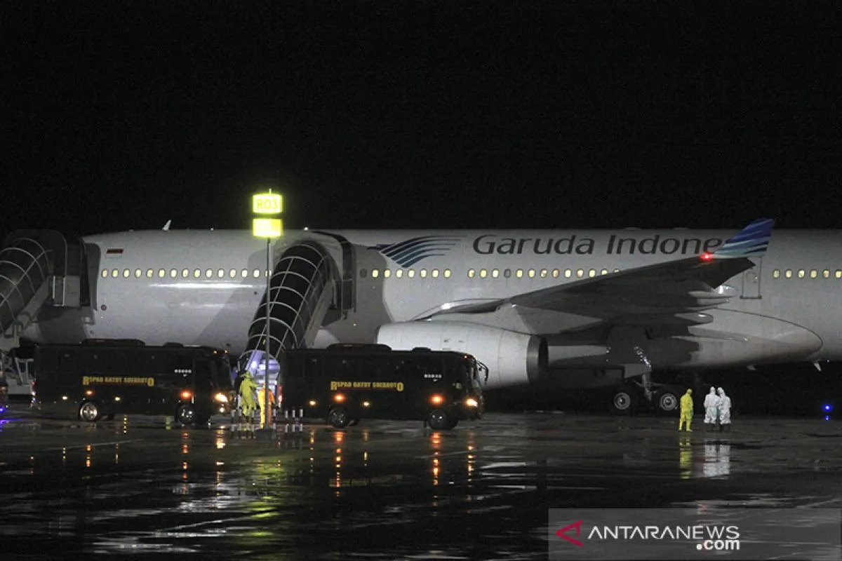 Petugas melakukan evakuasi WNI kru kapal Diamond Princess dari Jepang di bandara Kertajati, Majalengka, Senin (2/3/2020) Dinihari. Sebanyak 69 WNI Anak Buah Kapal (ABK) Diamond Princess yang tiba di Kertajati selanjutnya akan melanjutkan perjalanan menuju lokasi observasi di pulau Sebaru melalui pelabuhan PLTU Sumuradem. ANTARA JABAR/Dedhez Anggara/agr