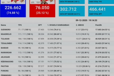 "Ini hasil perhitungan cepat secara real (real count) di 1.299 TPS yang tersebar di 171 desa/kelurahan 14 kecamatan," kata Koordinator Kolektif Relawan Nyawiji-Sumrambah Arif Setia Budi dikonfirmasi melalui telepon.
