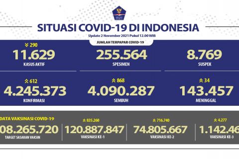 Sementara angka terkonfirmasi positif bertambah 612 kasus, sehingga secara keseluruhan menjadi 4.245.373 kasus. DKI Jakarta melaporkan kasus terkonfirmasi positif tertinggi harian sebanyak 77 kasus, diikuti Jawa Barat 75 kasus, Jawa Timur 74 kasus, dan Jawa Tengah 65 kasus.