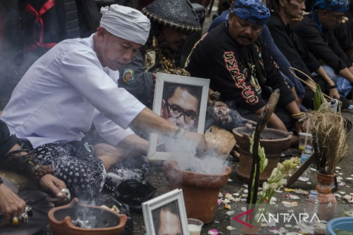 Massa yang tergabung dalam Masyarakat Penutur Bahasa dan Aliansi Masyarakat Sunda melakukan aksi ruwatan untuk Arteria Dahlan di Monumen Perjuangan Rakyat, Bandung, Jawa Barat, Kamis (3/2/2022). Aksi tersebut sebagai bentuk pengawalan dan tuntutan kepada Pimpinan dan MKD DPR RI agar Arteria Dahlan mendapatkan sanksi berat serta pergantian antar waktu terkait pernyataan yang dianggap menghina bahasa Sunda. ANTARA FOTO/Novrian Arbi/agr