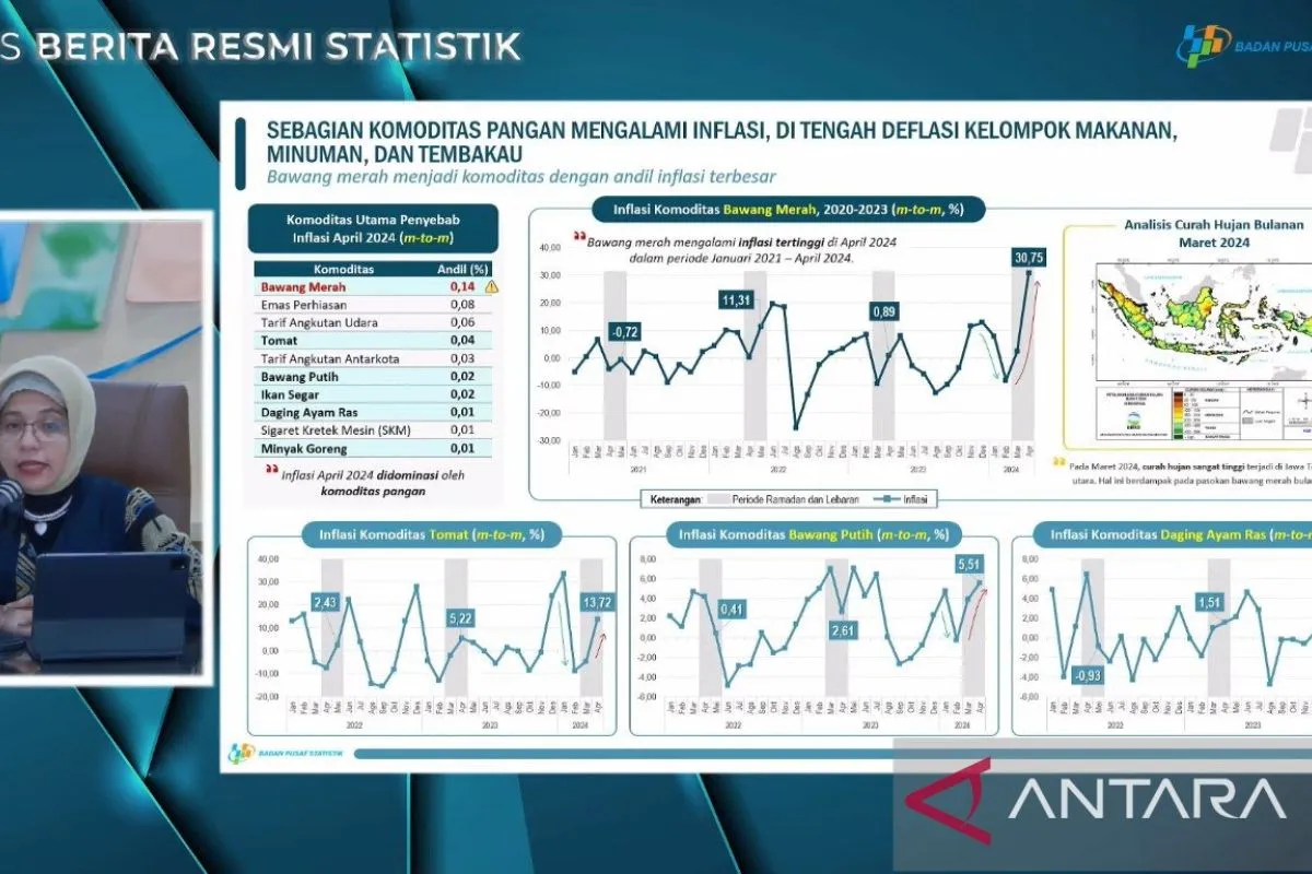 Jakarta (ANTARA) - Badan Pusat Statistik (BPS) menyatakan bahwa bawang merah adalah komoditas pangan dengan tingkat inflasi bulanan tertinggi, yakni sebesar 30,75 persen month-to-month (mtm), pada April 2024 karena persediaan yang menurun di beberapa wilayah.