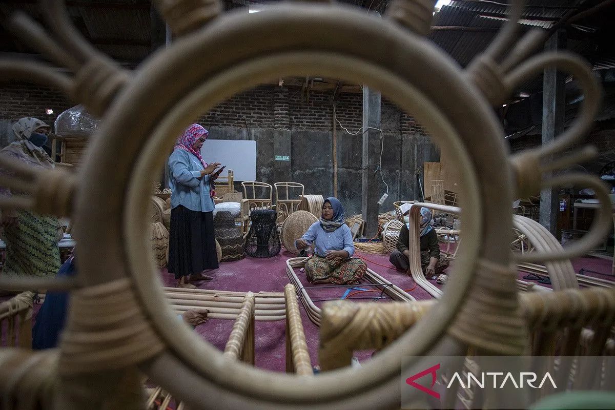 Pekerja menyelesaikan pembuatan kerajinan rotan di sentra produksi rotan Weru, Cirebon, Jawa Barat, Sabtu (15/6/2024). Pemprov Jawa Barat akan terus menggenjot ekspor rotan dengan menjajaki pasar Eropa, Afrika Utara dan Asia untuk meningkatkan ekspor produk rotan yang telah mengalami penurunan ekspor sebesar 40 persen sepanjang tahun 2023. ANTARA FOTO/Dedhez Anggara/agr