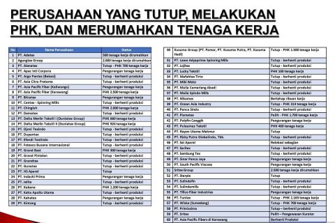 Asosiasi Produsen Serat dan Benang Filament Indonesia (APSYFI) pekan lalu mengonfirmasi kebenaran data yang beredar di mana ada setidaknya 61 pabrik tekstil yang tutup, berhenti beroperasi, dan mem-PHK ribuan karyawannya.