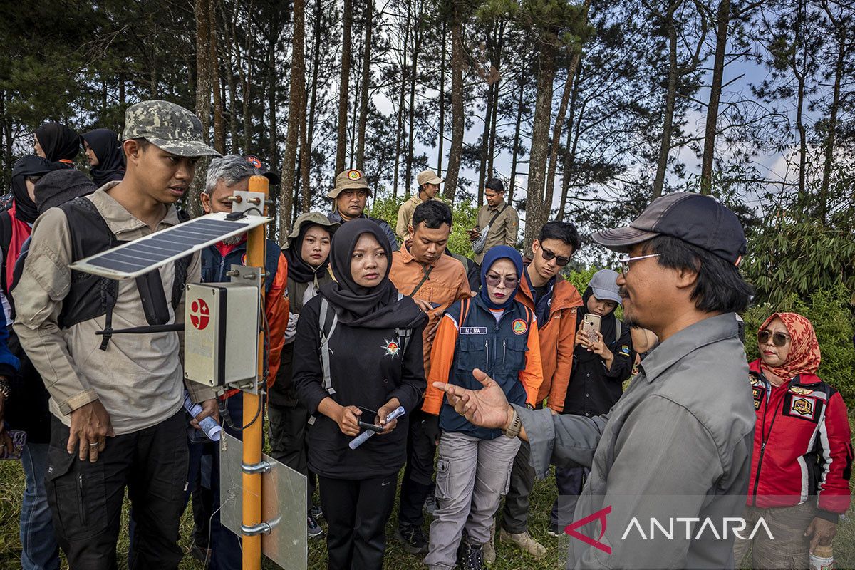 Peneliti BRIN Mudrik Rahmawan Daryono (kanan) memberikan penjelasan terkait alat pemantau ancaman gerakan tanah saat kegiatan geotrack (pelacakan geografis) pengenalan Sesar Lembang di kawasan Gunung Batu, Lembang, Kabupaten Bandung Barat, Jawa Barat, Minggu (24/8/2025). Kegiatan yang digelar BPBD Kota Bandung dan diikuti oleh relawan kebencanaan serta masyarakat umum tersebut untuk memberikan sosialisasi dan edukasi tentang Sesar Lembang guna meningkatkan kesiapsiagaan dan mitigasi bencana. ANTARA FOTO/Abdan Syakura/agr