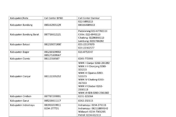 Berikut daftar nomor BNPB dan Damkar di setiap Kota dan Kabupaten dilansir dari akun Instagram BNPB Jabar: