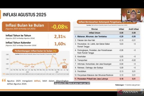 Jakarta (ANTARA) - Badan Pusat Statistik (BPS) menyatakan penurunan harga pangan menjadi faktor yang menyebabkan perekonomian mengalami deflasi sebesar 0,08 persen secara bulanan (month-to-month/mtm) pada Agustus 2025.