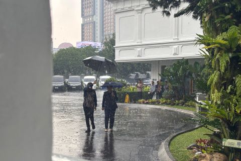 Hujan deras yang mengguyur halaman Istana pada Rabu siang turut mewarnai suasana menjelang pelantikan menteri dan wakil menteri di Istana Negara, Jakarta, Rabu siang.