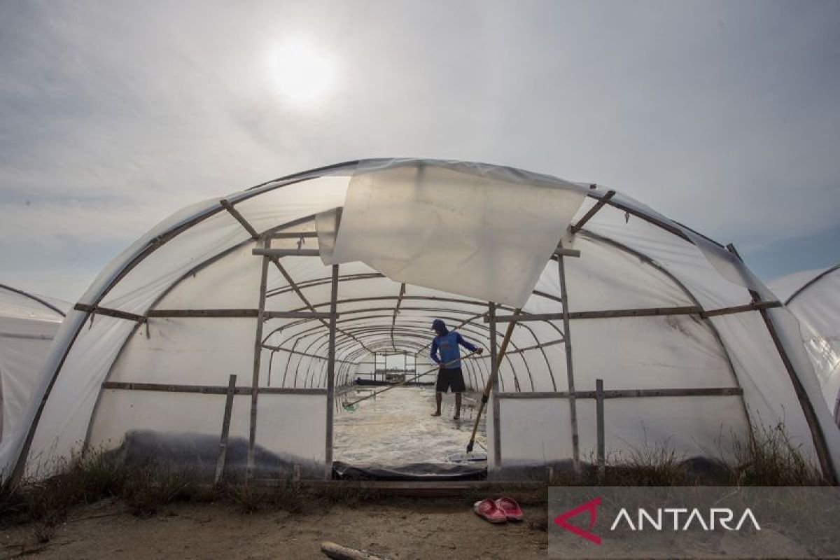 Pekerja memanen garam yang menggunakan teknologi tunnel geomembrane milik Koperasi Produsen Garam Inti Rakyat di Desa Kalianyar, Kabupaten Indramayu, Jawa Barat, Minggu (19/10/2025). Kementerian Kelautan dan Perikanan (KKP) merancang modeling ekstensifikasi dan intensifikasi kawasan tambak garam di lima lokasi dengan lahan seluas 2.000 hektar untuk mewujudkan swasembada garam pada 2027 dan menciptakan penyerapan tenaga kerja sebanyak 6.000 orang. ANTARA FOTO/Dedhez Anggara/agr