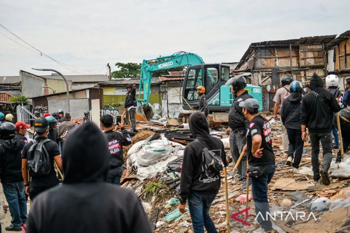 Alat berat memasuki permukiman saat aksi jaga lahan di Sukahaji, Bandung, Jawa Barat, Rabu (3/12/2025). Warga Sukahaji menolak penggusuran rumah secara sepihak yang dilakukan oleh PT Sakura karena warga menganggap konflik dengan perusahaan itu belum ada putusan inkrah dari pengadilan. ANTARA FOTO/Raisan Al Farisi/agr