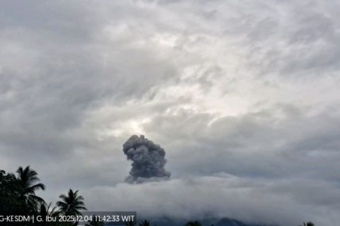 Dia menjelaskan kolom abu Gunung Ibu teramati berwarna kelabu dengan intensitas tebal condong ke timur laut dan timur.