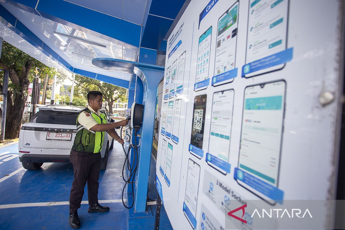 Petugas keamanan bertugas di lokasi Stasiun Pengisian Kendaraan Listrik Umum (SPKLU) di Kantor PLN Indramayu, Jawa Barat, Senin (9/3/2026). PT PLN (Persero) menyiagakan 1.681 unit SPKLU di Jalur Mudik yang tersebar di 994 lokasi sepanjang jalur mudik dengan peningkatan kapasitas pengisian daya. ANTARA FOTO/Dedi Suwidiantoro/agr