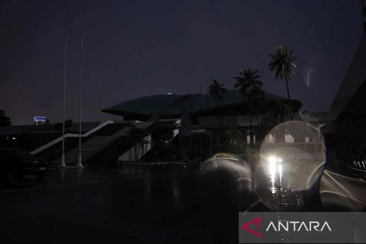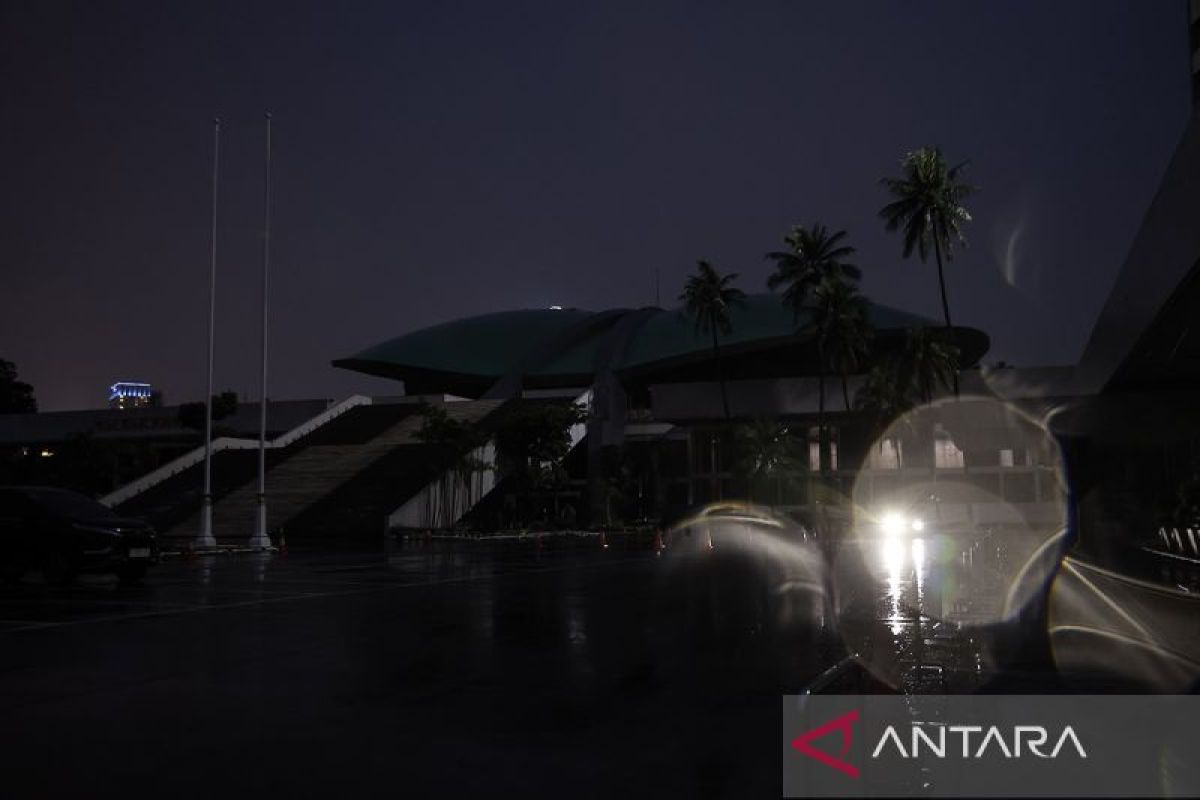 Suasana pemadaman listrik di Gedung Nusantara, Kompleks Parlemen, Senayan Jakarta, Rabu (1/4/2026). Sekretariat Jenderal DPR menerapkan kebijakan efisiensi energi sebagai respons atas gejolak harga bahan bakar minyak (BBM) dunia diantaranya dengan pengaturan penggunaan listrik yang dipadamkan mulai pukul 18.00 WIB. ANTARA FOTO/Dhemas Reviyanto/agr