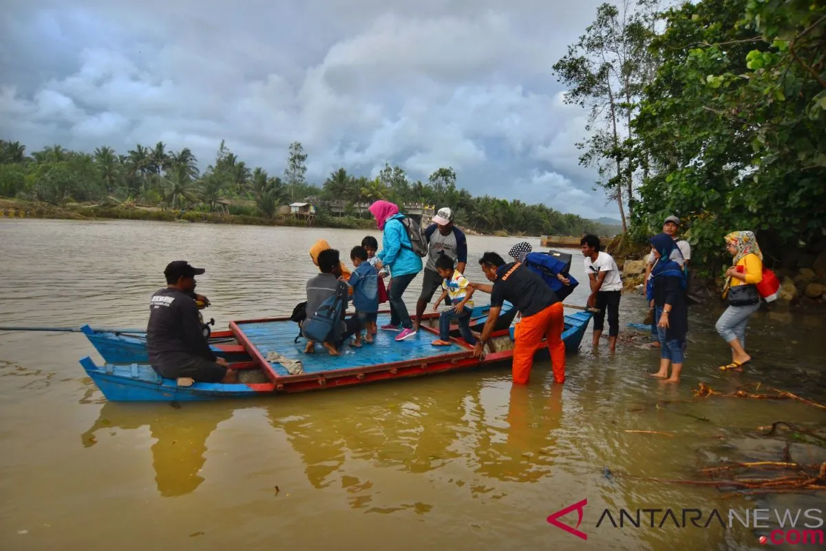 Warga menyebrang menggunakan perahu di muara sungai Cipatujah, Kabupaten Tasikmalaya, Jawa Barat, Kamis (15/11/2018). Pasca Jembatan Pasanggrahan, Cipatujah atau jembatan Pansel Jabar ambruk yang menghubungkan Kabupaten Tasikmalaya dengan Kabupaten Garut terpaksa harus menggunakan perahu nelayan untuk melintasi sungai tersebut sehingga aktivitas perekonomian warga terganggu. ANTARA JABAR/Adeng Bustomi/agr.