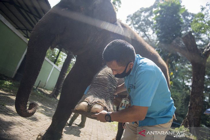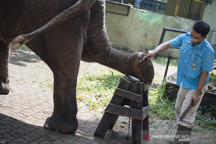 Pawang gajah (keeper) membersihkan kuku dan telapak kaki seekor gajah Sumatera saat perawatan satwa di Kebun Binatang Bandung, Jawa Barat, Senin (14/9/2020). Perawatan tersebut guna menjaga kesehatan satwa dan memudahkan gajah berjalan di atas permukaan beton atau "paving block" yang relatif keras. ANTARA JABAR/M Agung Rajasa/agr