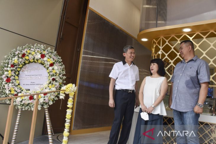 Komisaris Utama PT Hartadinata Abadi Tbk, Ferriyady Hartadinata (kiri) dan Direktur Utama PT Hartadinata Abadi Tbk, Sandra Sunanto (keda kiri) melihat perhiasan emas saat peresmian gerai Hartadinata Abadi Store di Kota Tasikmalaya, Jawa Barat, Senin (25/4/2022). PT Hartadinata Abadi Tbk meluncurkan flagship store yang menjual produk EmasKITA dan Kencana untuk mendorong inklusifitas emas. ANTARA FOTO/Adeng Bustomi/agr