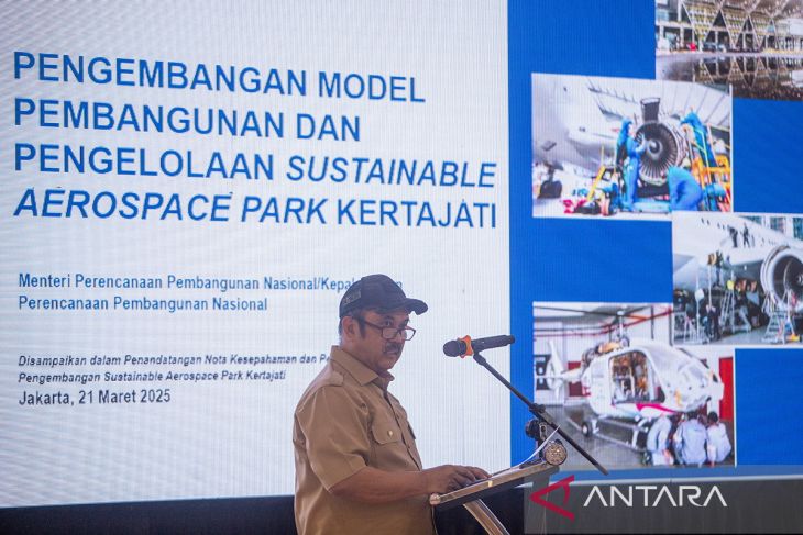 Menteri PPN/Kepala Bappenas Rachmat Pambudy memberikan sambutan saat penandatanganan perjanjian induk dan nota kesepahaman dalam pengembangan dan pembangunan Aerospace Kertajati di Bandara Kertajati, Majalengka, Jawa Barat, Senin (21/4/2025). Pendatanganan kesepakatan antara Kementerian PPN/Bappanas dan PT Garuda Manitenance Facility Aero Asia serta PT BIJB itu sebagai langkah untuk mendorong Bandara Kertajati sebagai kawasan industri kedirgantaraan. ANTARA FOTO/Dedhez Anggara/agr