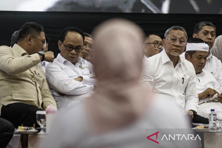 Menteri Koordinator (Menko) Bidang Pangan Zulkifli Hasan (kedua kanan) bersama Menteri Koperasi Budi Arie (kedua kiri), Wakil Menteri Pertanian Suadryono (kiri) dan Gubernur Jawa Barat Dedi Mulyadi (kanan) mendengarkan pertanyaan saat dialog kegiatan Peluncuran dan Dialog Percepatan Pembentukan Koperasi Desa dan Kelurahan Merah Putih di Hall Indoor Stadion Si Jalak Harupat, Kabupaten Bandung, Jawa Barat, Kamis (15/5/2025). Menko Pangan Zulkifli Hasan memberikan sosialisasi terkait tata cara serta aturan pembentukan Koperasi Desa Merah Putih kepada sedikitnya 6000 kepala desa se-Jawa Barat untuk percepatan target sebanyak 80 ribu Koperasi Desa Merah Putih se-Indonesia agar bisa diresmikan pada Oktober 2025 mendatang. ANTARA FOTO/Novrian Arbi/agr