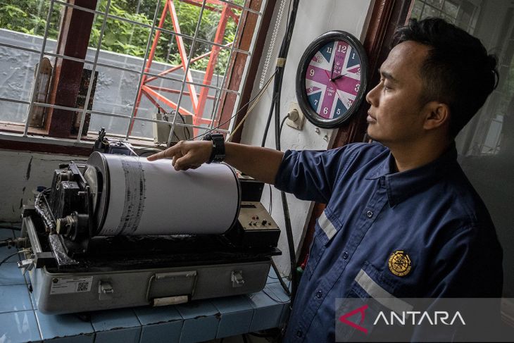 Petugas memeriksa grafik seismograf aktivitas Gunung Tangkuban Parahu di Pos Pemantauan Gunung Api Tangkuban Parahu di Kabupaten Bandung Barat, Jawa Barat, Selasa (3/6/2025). Berdasarkan pemantauan Badan Geologi Kementerian Energi dan Sumber Daya Mineral (ESDM) pada periode 30 Mei hingga 2 Juni 2025 tercatat adanya peningkatan aktivitas vulkanik Gunung Tangkuban Parahu berupa 21-37 kejadian gempa hembusan serta 134 kejadian gempa frekuensi rendah, sementara status aktivitas gunung tersebut masih berada pada Level I atau Normal. ANTARA FOTO/Abdan Syakura/agr