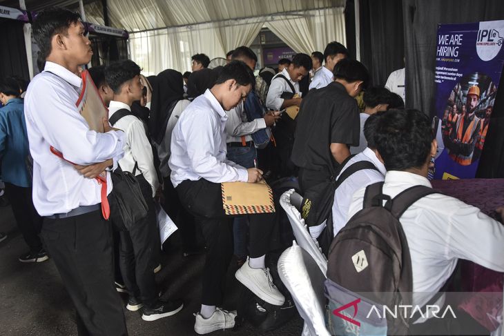 Ribuan calon pelamar kerja antre saat menghadiri Ciamis Job Fair 2025 di kantor Kecamatan Cijeungjing, Kabupaten Ciamis, Jawa Barat, Rabu (25/6/2025). Dinas Tenaga Kerja Ciamis bekerja sama dengan 14 perusahaan swasta membuka kuota lowongan pekerjaan untuk 1.150 orang dengan jumlah pendaftar melalui daring 2.600 pelamar. ANTARA FOTO/Adeng Bustomi/agr