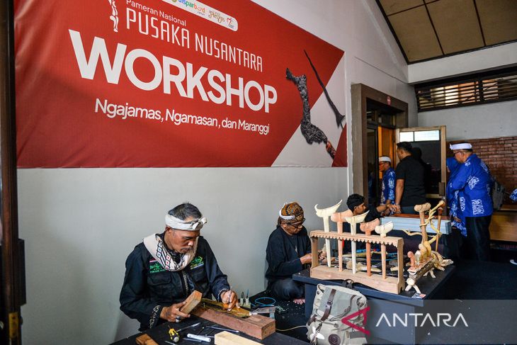 Perajin dari Jawa Barat menyelesaikan pembuatan kris saat mengikuti Pameran Pusaka Nusantara di Museum Sri Baduga, Bandung, Jawa Barat, Selasa (29/7/2025). Kota Bandung menjadi tuan rumah untuk penyelenggaraan Pameran Pusaka Nusantara yang menampilkan 238 koleksi seperti kujang, keris, kudi, dan pedang dari 21 museum berbagai wilayah di Indonesia yang digelar dalam rangka ajang silaturahmi para pengelola museum di Indonesia serta meningkatkan akses dan jangkauan publik mengenai keberagaman budaya melalui pusaka. ANTARA FOTO/Raisan Al Farisi/agr
