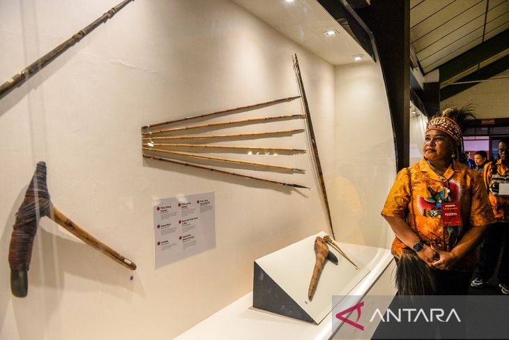 Warga Papua mengamati pusaka dari papua yang dipamerkan pada Pameran Pusaka Nusantara di Museum Sri Baduga, Bandung, Jawa Barat, Selasa (29/7/2025). Kota Bandung menjadi tuan rumah untuk penyelenggaraan Pameran Pusaka Nusantara yang menampilkan 238 koleksi seperti kujang, keris, kudi, dan pedang dari 21 museum berbagai wilayah di Indonesia yang digelar dalam rangka ajang silaturahmi para pengelola museum di Indonesia serta meningkatkan akses dan jangkauan publik mengenai keberagaman budaya melalui pusaka. ANTARA FOTO/Raisan Al Farisi/agr