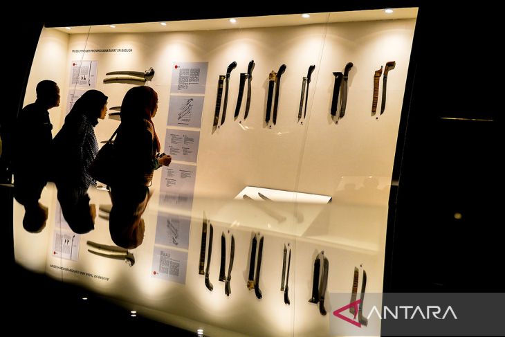 Pengunjung mengamati keris pusaka dari Jawa Barat yang dipamerkan pada Pameran Pusaka Nusantara di Museum Sri Baduga, Bandung, Jawa Barat, Selasa (29/7/2025). Kota Bandung menjadi tuan rumah untuk penyelenggaraan Pameran Pusaka Nusantara yang menampilkan 238 koleksi seperti kujang, keris, kudi, dan pedang dari 21 museum berbagai wilayah di Indonesia yang digelar dalam rangka ajang silaturahmi para pengelola museum di Indonesia serta meningkatkan akses dan jangkauan publik mengenai keberagaman budaya melalui pusaka. ANTARA FOTO/Raisan Al Farisi/agr
