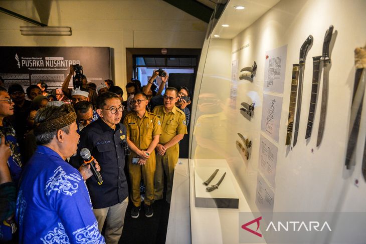 Menteri Kebudayaan Fadli Zon (kedua kiri) mengamati kris pusaka dari Jawa Barat yang dipamerkan pada Pameran Pusaka Nusantara di Museum Sri Baduga, Bandung, Jawa Barat, Selasa (29/7/2025). Kota Bandung menjadi tuan rumah untuk penyelenggaraan Pameran Pusaka Nusantara yang menampilkan 238 koleksi seperti kujang, keris, kudi, dan pedang dari 21 museum berbagai wilayah di Indonesia yang digelar dalam rangka ajang silaturahmi para pengelola museum di Indonesia serta meningkatkan akses dan jangkauan publik mengenai keberagaman budaya melalui pusaka. ANTARA FOTO/Raisan Al Farisi/agr