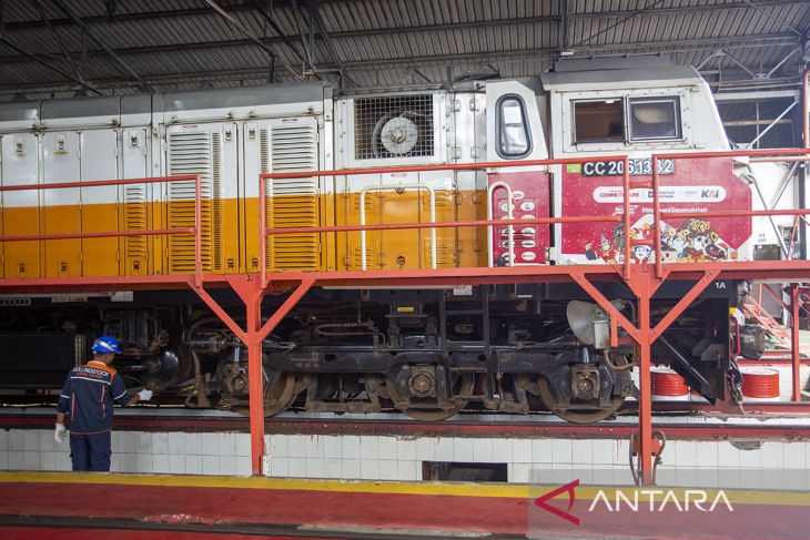 Petugas memeriksa lokomotif kereta api saat perawatan rutin di Depo Lokomotif Daop 3 Cirebon, Jawa Barat, Kamis (5/3/2026). Perawatan lokomotif yang dikelola Daop 3 Cirebon tersebut sebagai upaya untuk memberikan kenyamanan dan keamanan bagi penumpang termasuk saat arus mudik Lebaran 2026. ANTARA FOTO/Dedi Suwidiantoro/agr
