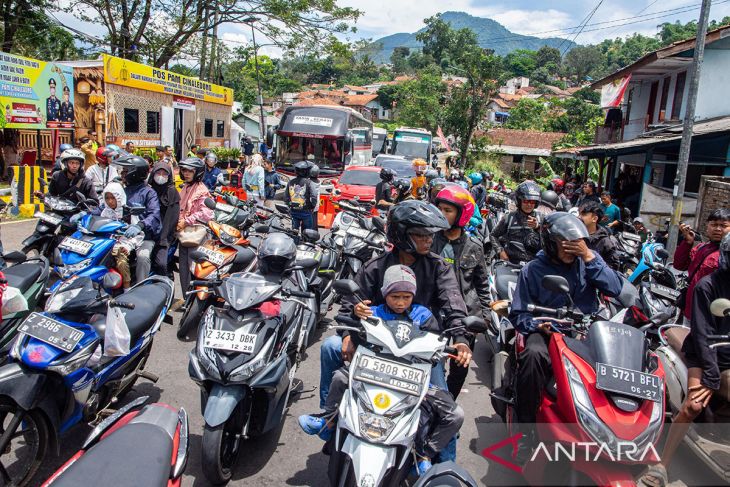 Pengendara menunggu dan mematikan mesin sepeda motor saat pemberlakukan rekayasa lalu lintas buka tutup jalur Nagreg di Kabupaten Bandung, Jawa Barat, Selasa (24/3/2026). Satlantas Polresta Bandung memberlakukan buka tutup jalur selama 15 menit untuk mengurai kemacetan arus balik dengan jumlah kendaraan mencapai 63.512 hingga pukul 12.00 WIB dari arah Garut menuju Bandung dan Jakarta. ANTARA FOTO/Novrian Arbi/agr