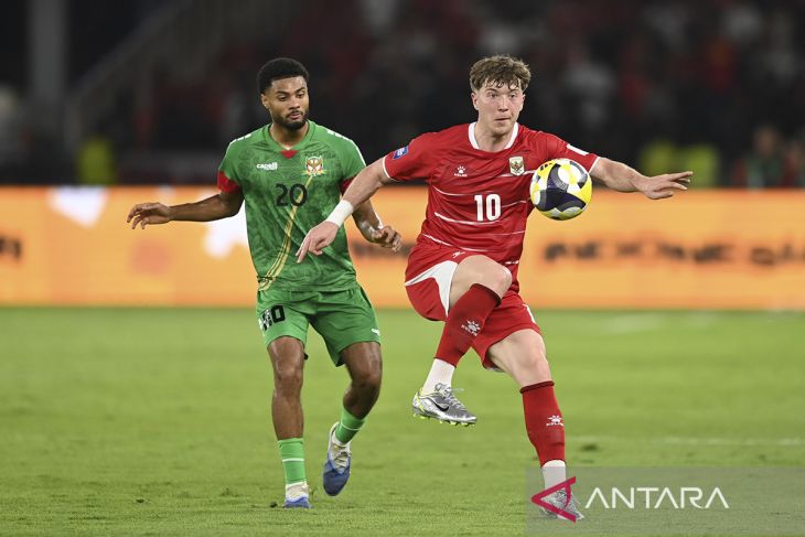 Pesepak bola Timnas Indonesia Eliano Reijnders (kiri) berebut bola dengan pesepak bola Saint Kitts and Nevis Daron Thomas (kanan) saat pertandingan FIFA Series 2026 di Stadion Utama Gelora Bung Karno (SUGBK), Senayan, Jakarta, Jumat (27/3/2026). Indonesia melaju ke final FIFA Series setelah menang 4-0 atas Saint Kitts and Nevis. ANTARA FOTO/Asprilla Dwi Adha/agr