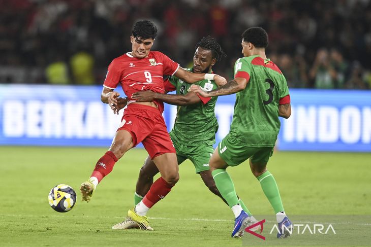 Pesepak bola Timnas Indonesia Ramadhan Sananta (kiri) berebut bola dengan pesepak bola Saint Kitts and Nevis Yohannes Mitchum (tengah) dan Ethan Bristow (kanan) saat pertandingan FIFA Series 2026 di Stadion Utama Gelora Bung Karno (SUGBK), Senayan, Jakarta, Jumat (27/3/2026). Indonesia melaju ke final FIFA Series setelah menang 4-0 atas Saint Kitts and Nevis. ANTARA FOTO/Asprilla Dwi Adha/agr