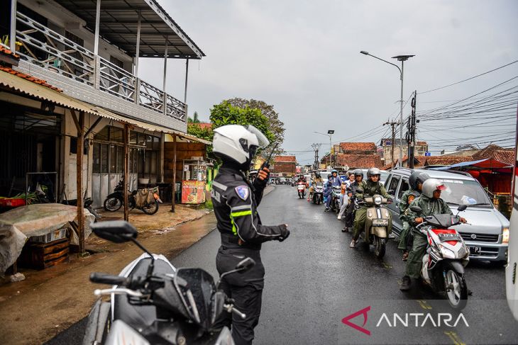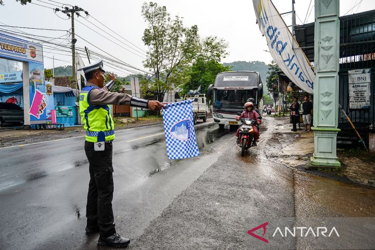 Polisi mengatur lalu lintas saat pemberlakuan sistem satu arah di Limbangan, Kabupaten Garut, Jawa Barat, Sabtu (28/3/2026). Ditlantas Polda Jabar bersama Polres Garut memberlakukan rekayasa lalu lintas satu arah dengan durasi 15 hingga 30 menit untuk mengurai kemacetan arus balik kendaraan dari Kabupaten Garut menuju Bandung. ANTARA FOTO/Raisan Al Farisi/agr