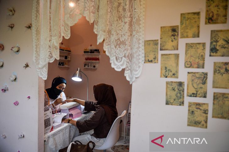 Pekerja merias kuku seorang pengunjung di Bella Donna Nail Art di Bandung, Jawa Barat, Senin (6/4/2026). Pemerintah memutuskan menaikkan alokasi plafon Kredit Usaha Rakyat (KUR) pada tahun 2026 menjadi Rp320 triliun atau lebih tinggi dari target tahun 2025 yang sebesar Rp286,61 triliun. ANTARA FOTO/Raisan Al Farisi/agr