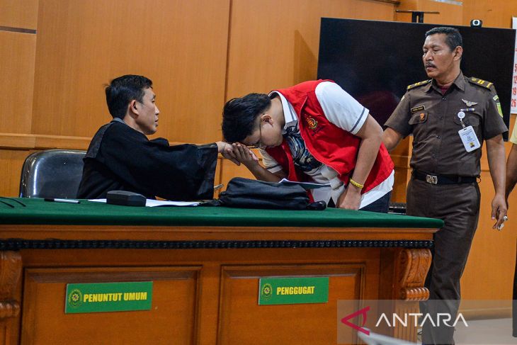 Terdakwa dugaan kasus penghinaan terhadap Suku Sunda Muhammad Adimas Firdaus Putra Nasihan alias Resbob (tengah) menyalami jaksa penuntut umum sebelum menjalani sidang di Pengadilan Negeri Bandung, Jawa Barat, Senin (13/4/2026). Dalam sidang tersebut Jaksa penuntut umum menuntut Resbob dua tahun enam bulan penjara. ANTARA FOTO/Raisan Al Farisi/agr
