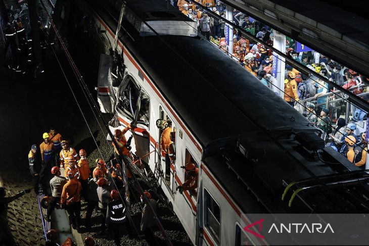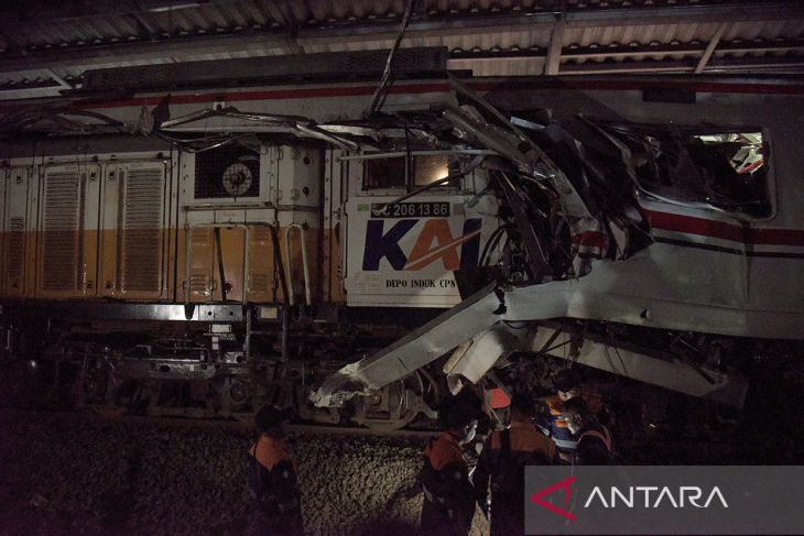 Petugas memeriksa kondisi gerbong KRL Commuterline yang bertabrakan dengan KA Argo Bromo Anggrek relasi Gambir-Surabaya Pasar Turi di Stasiun Bekasi Timur, Bekasi, Jawa Barat, Senin (27/4/2026). ANTARA FOTO/Paramayuda/agr
