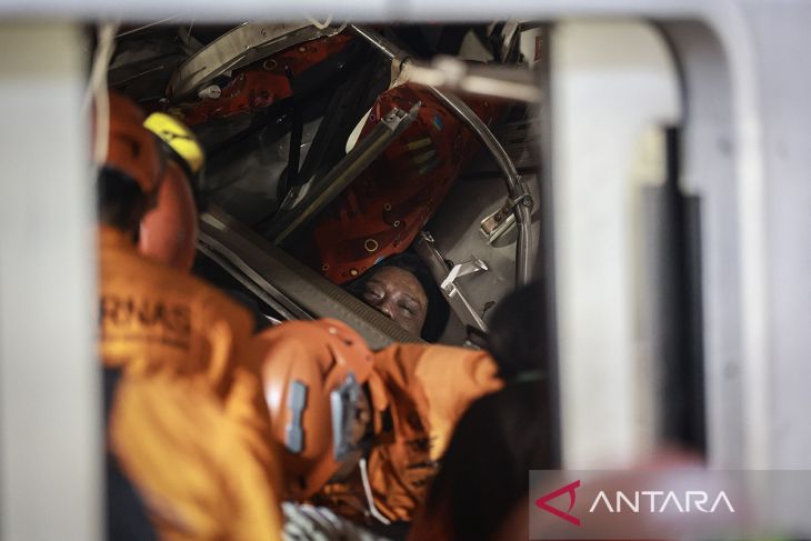 Petugas mengevakuasi korban yang masih terjebak di dalam gerbong KRL Commuterline yang bertabrakan dengan KA Argo Bromo Anggrek relasi Gambir-Surabaya Pasar Turi di Stasiun Bekasi Timur, Bekasi, Jawa Barat, Senin (27/4/2026). ANTARA FOTO/Dhemas Reviyanto/agr