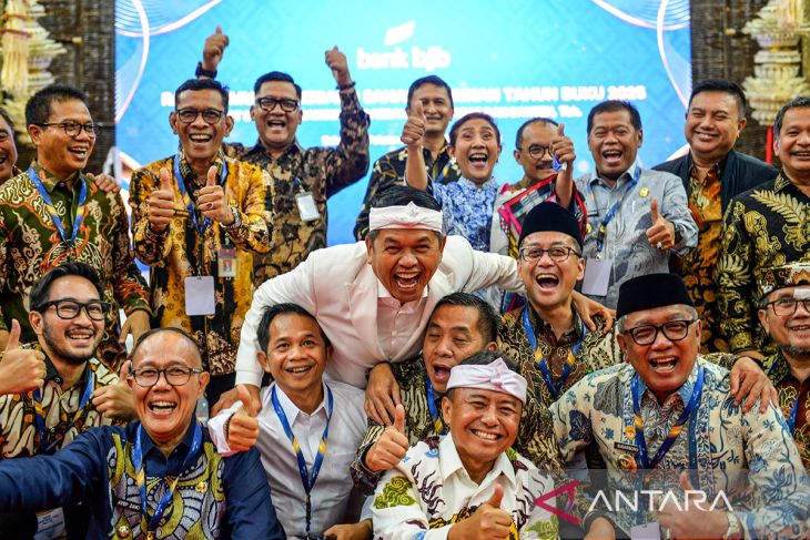 Gubernur Jawa Barat Dedi Mulyadi (tengah) berfoto bersama Direktur Utama Bank BJB Ayi Subarna (ketiga kiri), Komisaris Utama Independen Bank BJB Susi Pudjiastuti (kelima kanan), dan jajaran direksi usai Rapat Umum Pemegang Saham Tahunan (RUPST) Tahun Buku 2025 di Gedung Pakuan, Bandung, Jawa Barat, Selasa (28/4/2026). RUPST Tahun Buku 2025 Bank BJB menetapkan Susi Pudjiastuti sebagai Komisaris Utama Independen dan Ayi Subarna sebagai Direktur Utama, serta membagikan dividen sebesar Rp900 miliar kepada para pemegang saham. ANTARA FOTO/Raisan Al Farisi/agr