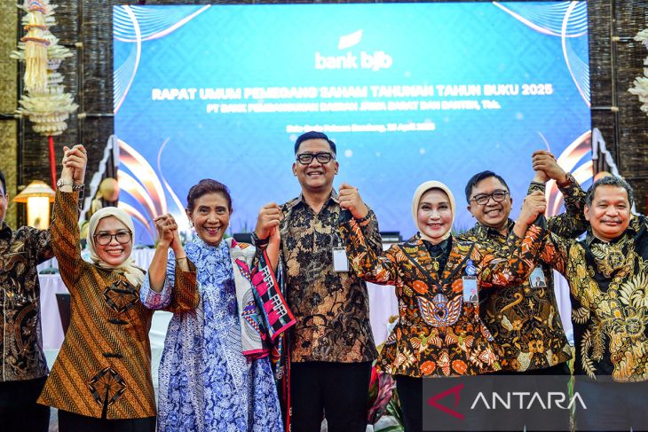 Direktur Utama Bank BJB Ayi Subarna (tengah) dan Komisaris Utama Independen Bank BJB Susi Pudjiastuti (kedua kiri) berfoto bersama dengan jajaran direksi usai Rapat Umum Pemegang Saham Tahunan (RUPST) Tahun Buku 2025 di Gedung Pakuan, Bandung, Jawa Barat, Selasa (28/4/2026). RUPST Tahun Buku 2025 Bank BJB menetapkan Susi Pudjiastuti sebagai Komisaris Utama Independen dan Ayi Subarna sebagai Direktur Utama, serta membagikan dividen sebesar Rp900 miliar kepada para pemegang saham. ANTARA FOTO/Raisan Al Farisi/agr