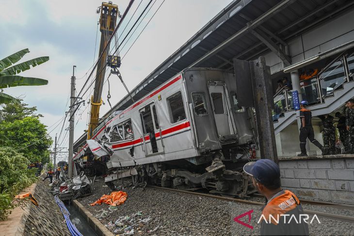 Petugas menggunakan alat berat mengevakuasi gerbong KRL Commuterline usai bertabrakan dengan KA Argo Bromo Anggrek relasi Gambir-Surabaya Pasar Turi di Stasiun Bekasi Timur, Bekasi, Jawa Barat, Selasa (28/4/2026). Menurut data KAI hingga pukul 08.45 WIB sebanyak 14 orang meninggal dunia dan 84 korban luka, akibat kecelakaan kereta api (KA) Argo Bromo Anggrek dengan KRL Commuterline. ANTARA FOTO/Galih Pradipta/agr