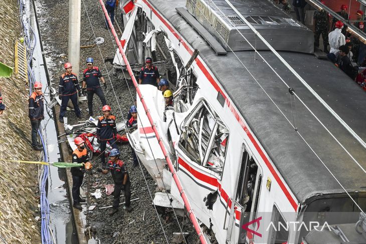 Petugas mengevakuasi gerbong KRL Commuterline dan KA Argo Bromo Anggrek relasi Gambir-Surabaya Pasar Turi pascakecelakaan di Stasiun Bekasi Timur, Bekasi, Jawa Barat, Selasa (28/4/2026). Menurut data KAI hingga pukul 08.45 WIB sebanyak 14 orang meninggal dunia dan 84 korban luka, akibat kecelakaan kereta api (KA) Argo Bromo Anggrek dengan KRL Commuterline. ANTARA FOTO/Galih Pradipta/agr