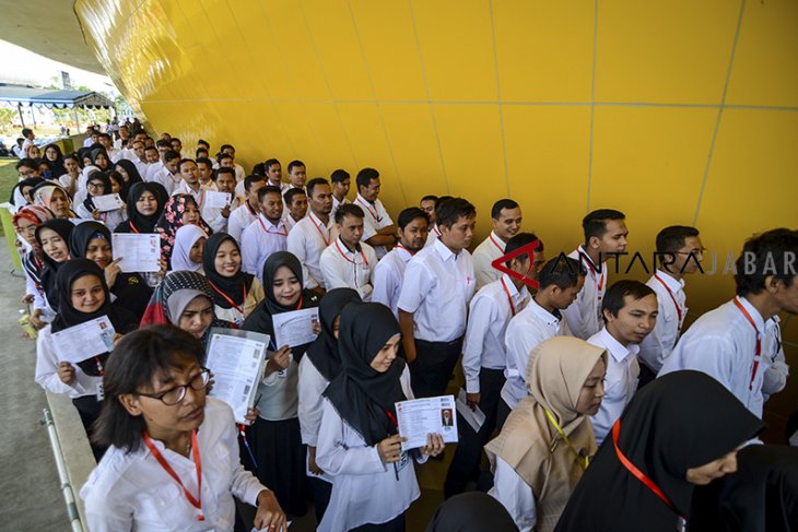 Peserta seleksi CPNS mengikuti rangkaian tes di Gor Arcamanik, Bandung, Jawa Barat, Jumat (26/10/2018). Sebanyak 27.450 peserta yang telah lolos verifikasi mengikuti seleksi untuk 1.085 penerimaan di tiga sektor yaitu tenaga kependidikan, kesehatan dan infrastuktur. ANTARA JABAR/Raisan Al Farisi/agr.