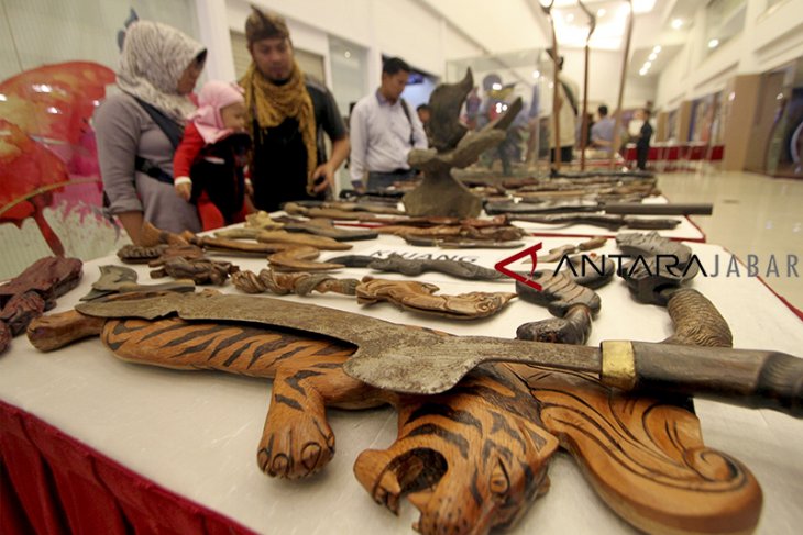 Pengunjung melihat pameran bertajuk "Pesona Pusaka Tanah Pasundan" di Lippo Plaza Ekalokasari, Bogor, Jawa Barat, Jumat (2/11/2018). Pameran yang menampilkan ratusan benda pusaka asal Jawa Barat tersebut bertujuan untuk menjaga dan melestarikan tradisi yang diwariskan oleh nenek moyang. ANTARA JABAR/Yulius Satria Wijaya/agr.