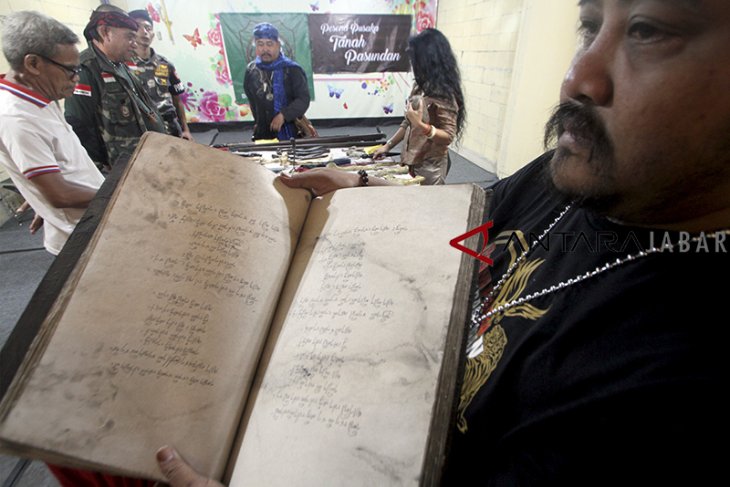 Peserta pameran menunjukkan naskah kuno dalam pameran bertajuk "Pesona Pusaka Tanah Pasundan" di Lippo Plaza Ekalokasari, Bogor, Jawa Barat, Jumat (2/11/2018). Pameran yang menampilkan ratusan benda pusaka asal Jawa Barat tersebut bertujuan untuk menjaga dan melestarikan tradisi yang diwariskan oleh nenek moyang. ANTARA JABAR/Yulius Satria Wijaya/agr.