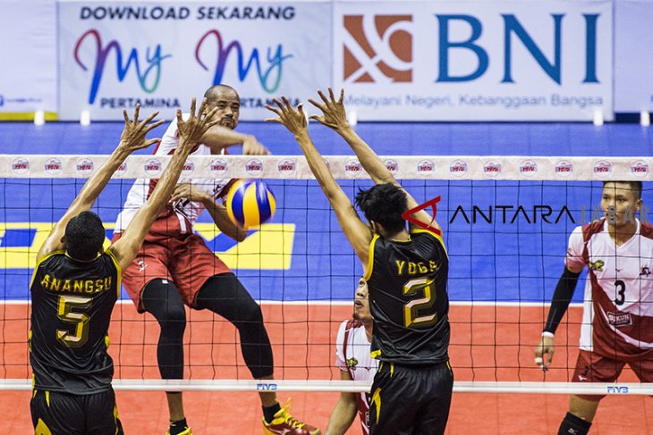 Pebola voli putra Sidoarjo Aneka gas Industri Akmal Alamsyah (kanan) berusaha mengembalikan bola ke arah tim Surabaya Bhayangkara Samator pada pertandingan seri ketiga putaran pertama Proliga 2019 di GOR C'Tra Arena, Bandung, Jawa Barat, Jumat (21/12/2018). Sidoarjo Aneka Gas Industri menang atas Surabaya Bhayangkara Samator dengan skor akhir 3-1 (23-25, 25-22, 25-18, 26-24). ANTARA JABAR/M Agung Rajasa/agr.